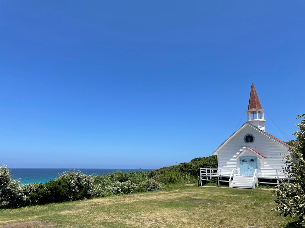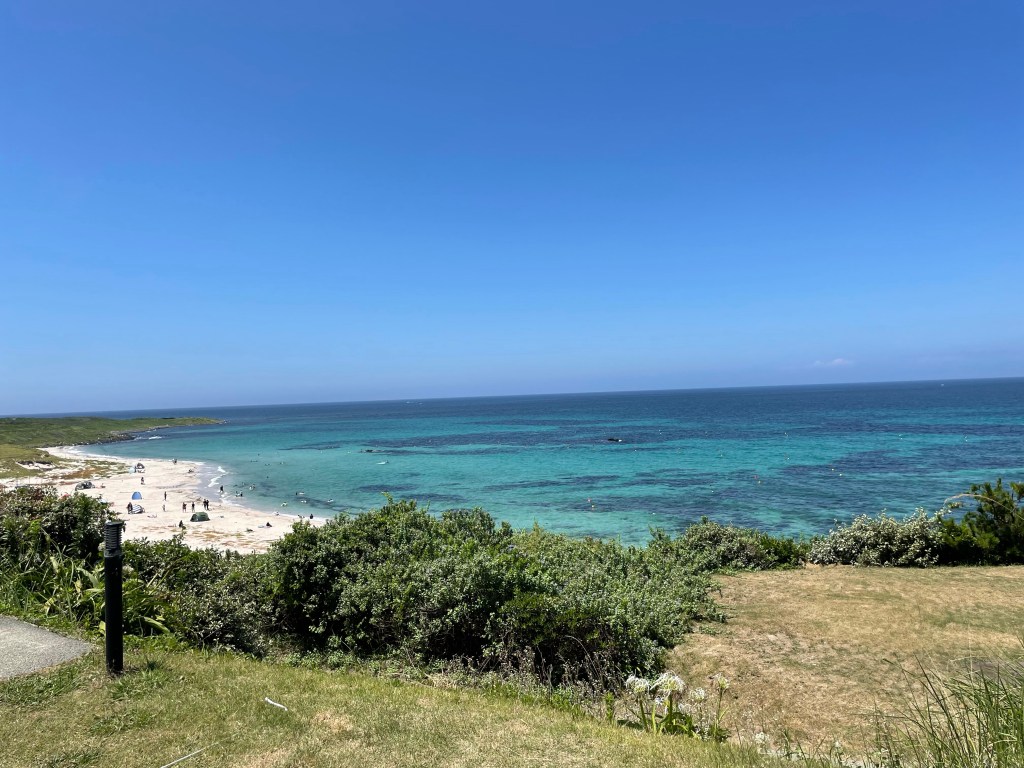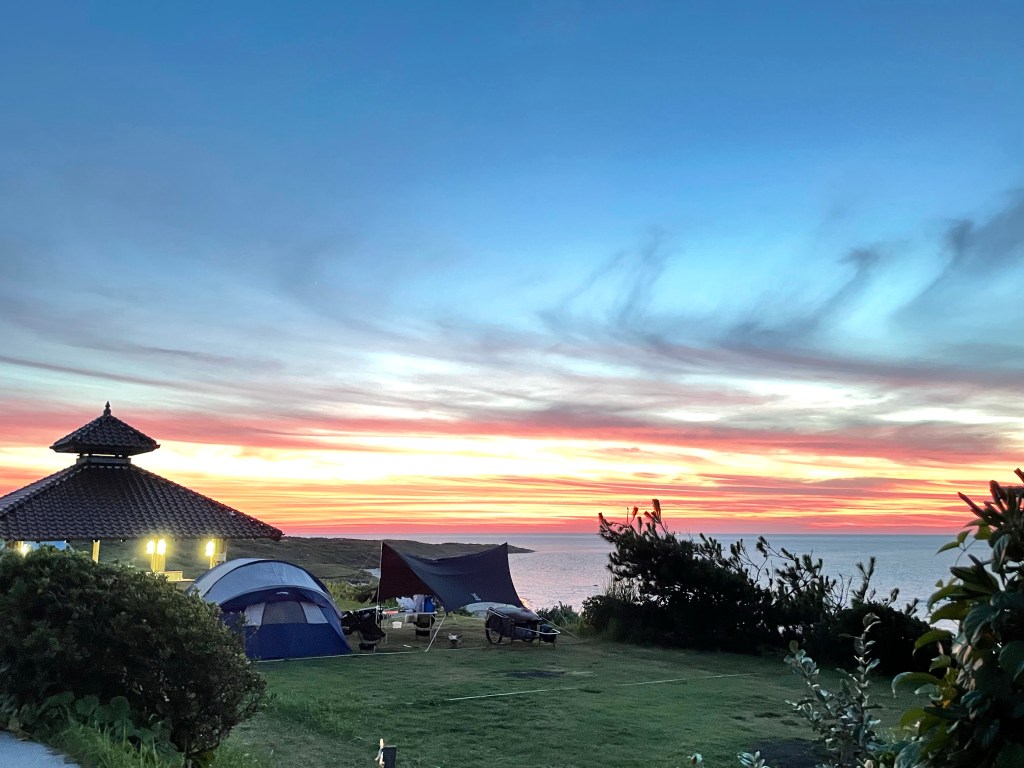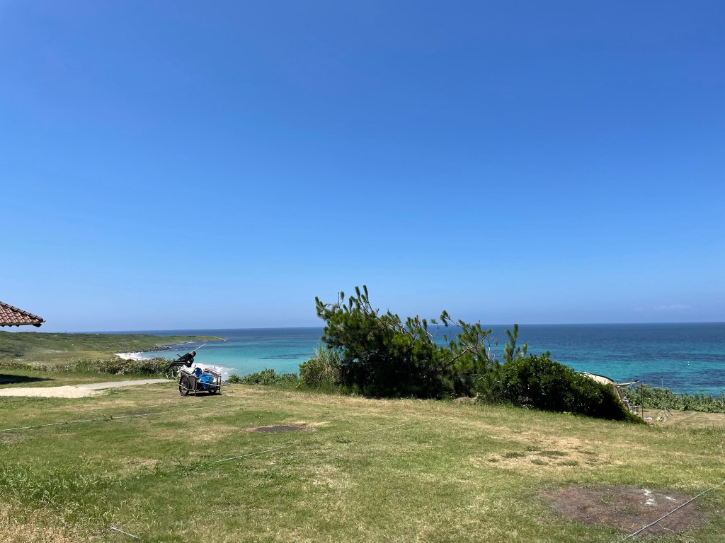 朝早くに到着したので、区画は見てから好きな場所を選ぶことができました。炊事場が近く海を一望できる区画に決定!眺め最高〜
